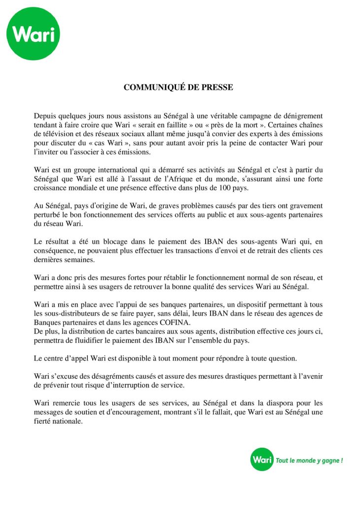 Au regard des informations qui soutenaient la faillite du transfert d’argent WARI, c’est au tour des responsables de la boite d’apporter un démenti. Dans un communiqué rendu public, nous pouvons lire:  » une situation instable des services proposés par le réseau de transfert d’argent est récemment noté avec l’incapacité de plusieurs opérateurs et distributeurs de mener des transactions. Une situation qui selon le groupe WARI serait causé par un blocage temporaire de certains comptes de distribution et non par une situation de faillite comme annoncée par certains internautes ».